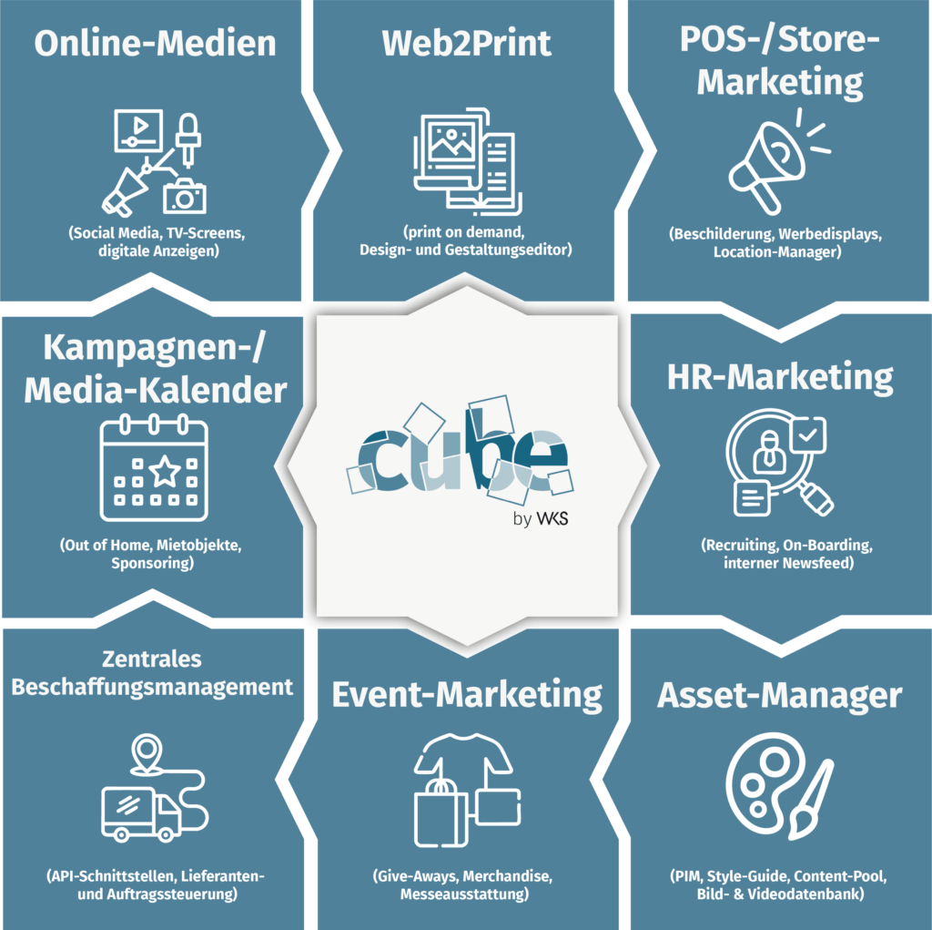 cube by WKS ist die modulare Softwarelösung für modernes Marketing- und Kommunikationsmanagement. Die Plattform ermöglicht es Unternehmen, sämtliche Marketingmaßnahmen – von digitalen Medien über Printprodukte und Events bis hin zur internen Kommunikation – zentral, effizient und CI-konform zu steuern.